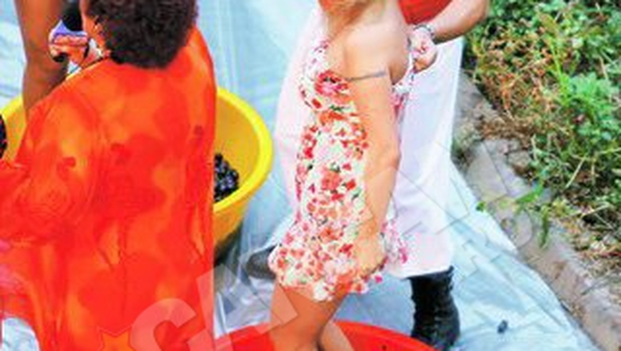Simona Trasca si Aurel Moldoveanu au oferit imagini memorabile, la o "campeneasca", in mijlocul unei podgorii. In timp ce blonda strivea strugurii cu picioarele, cantaretul de muzica usoara o tragea insistent de rochie, in speranta ca e facuta din material de proasta calitate.