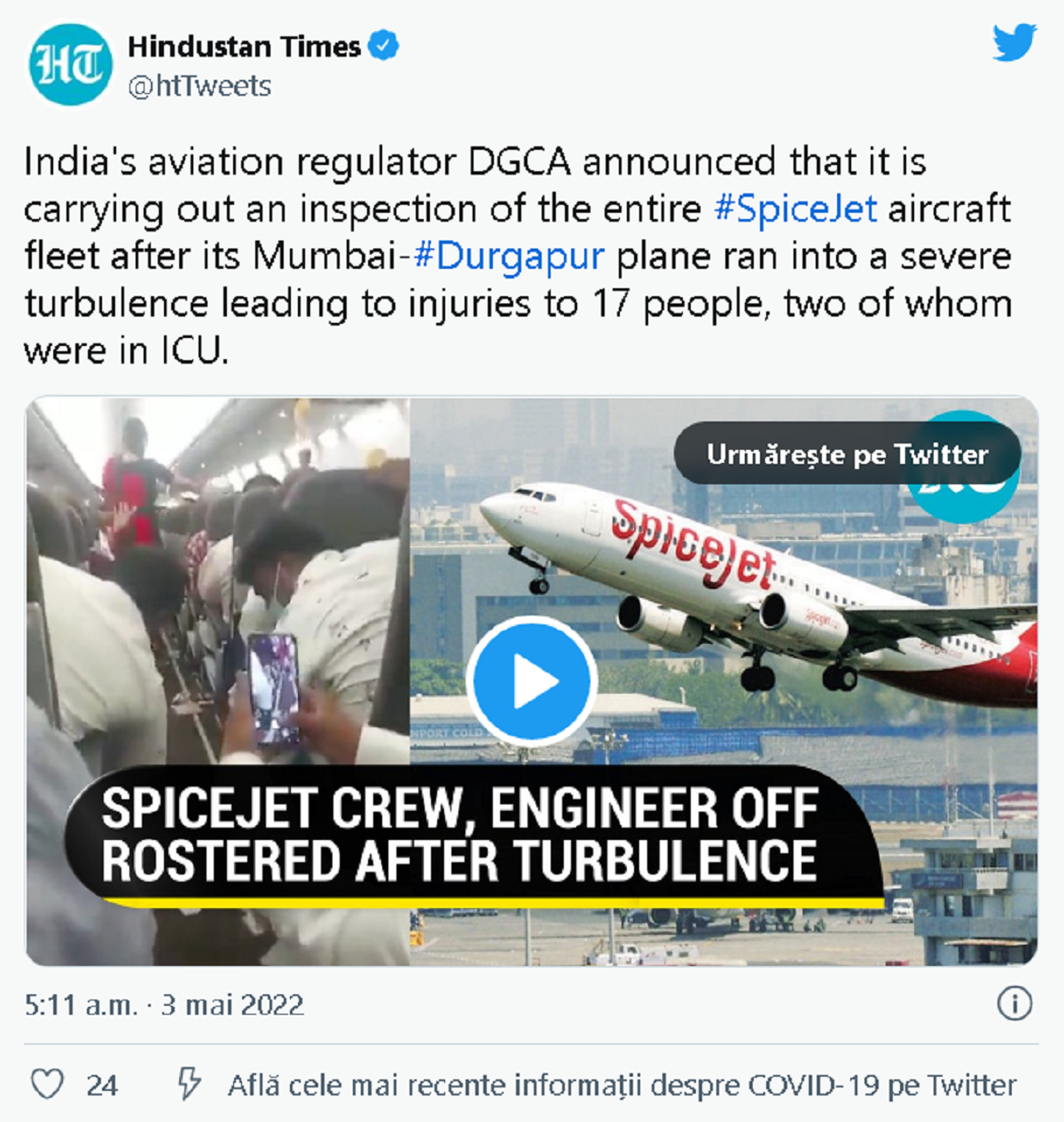 Avionul a plecat din Mumbai și s-a îndreptat spre Durfapur, India. Aeronava Boeing 737 care transporta 200 de persoane, a fost lovită de turbulențe severe în timpul aterizării. Potrivit primelor informații, se pare că 17 persoane au avut nevoie de îngrijiri medicale, două dintre ele fiind în stare gravă: