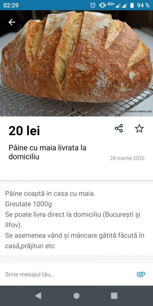Astfel, o pâine cu maia a ajuns să coste 20 de lei pe site-ul de vânzări OLX, informează gândul.ro. Pâinea poate fi livrată direct la domiciliu în București și Ilfov. Gospodinele vând tot pe site-ul de vânzări, de la pâine la mâncare gătită și prăjituri de casă.