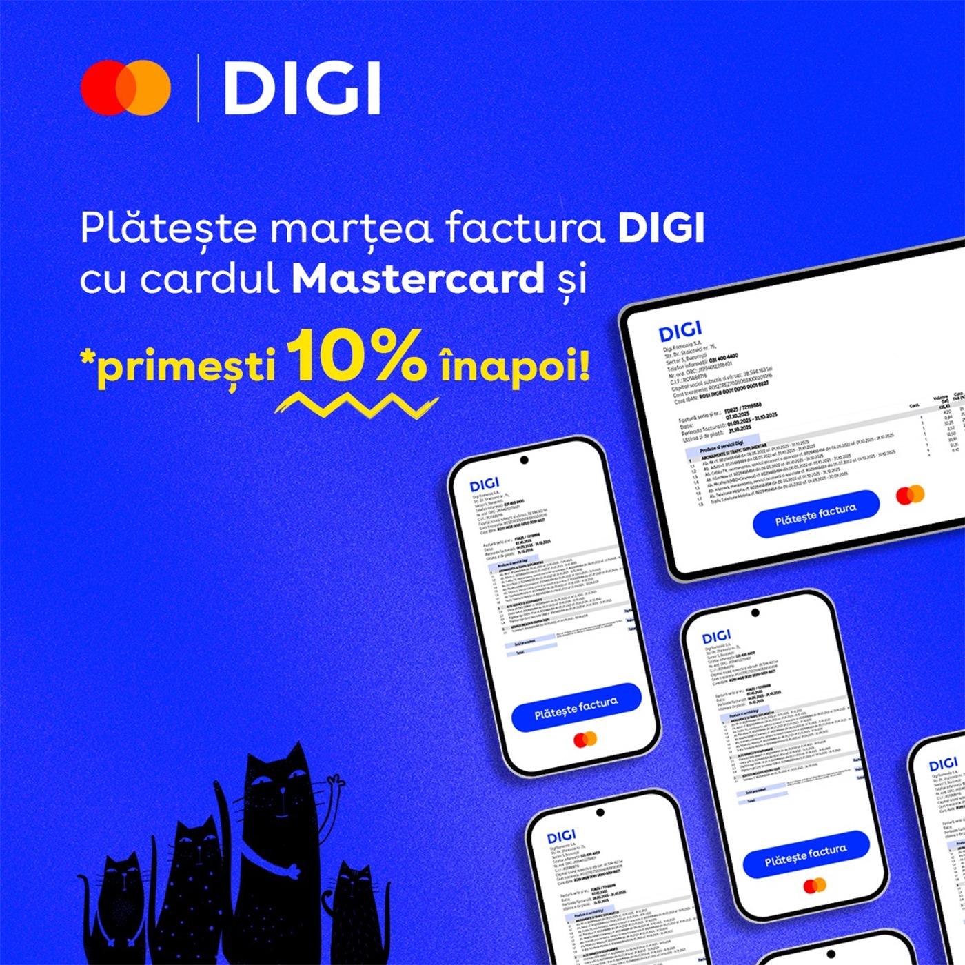Dacă alegi să plătești online factura Digi cu un card Mastercard înscris în campania „Marțea Mastercard”, primești 10% din sumă înapoi direct pe card. Este o ofertă simplă, fără complicații, care îi încurajează pe clienți să folosească plățile digitale și să profite de un beneficiu imediat.