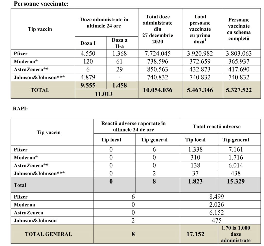 Din cauza faptului că descărcarea datelor din platforma RENV pentru ultimele 24 ore, respectiv pentru întreaga perioadă a campaniei de vaccinare, nu se poate realiza simultan și instantaneu, apar diferențe privind numărul de doze administrate în ultimele 24h. În intervalul de descărcare a datelor sunt înregistrate dozele administrate în această perioadă scurtă de timp.