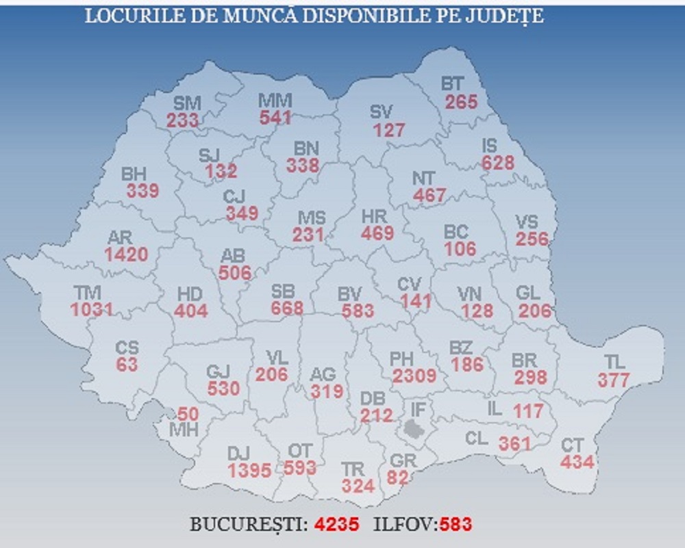 Situaţia locurilor de muncă vacante, în fiecare judeţ: Bucureşti – 4.235, Prahova – 2.309, Arad – 1.420, Dolj – 1.395, Timiş – 1.031, Sibiu – 668, Iaşi – 628, Olt – 593, Braşov – 583, Ilfov – 583, Maramureș – 541, Gorj – 530, Alba – 506, Harghita – 469, (CITEȘTE AICI: APROAPE 2.000 DE LOCURI DE MUNCĂ PENTRU ROMÂNI, ÎN EUROPA, CELE MAI MULTE ÎN SPANIA)