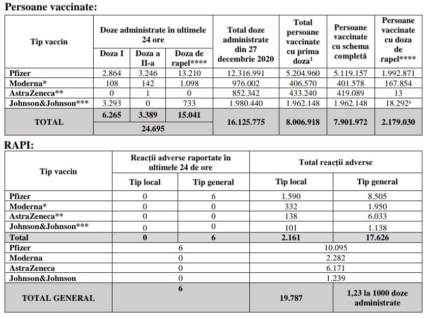 Potrivit raportului, în 24 de ore, s-au administrat 24.695 doze de vaccin. În total, de la ultima raportare care a avut loc marți, s-au înregistrat șase reacții adverse.