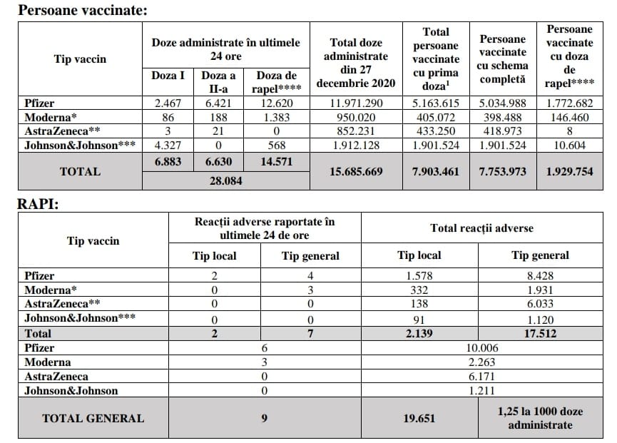 Potrivit raportului, în 24 de ore, s-au administrat 28.084 doze de vaccin. În total, de la ultima raportare care a avut loc luni, s-au înregistrat 9 reacții adverse.