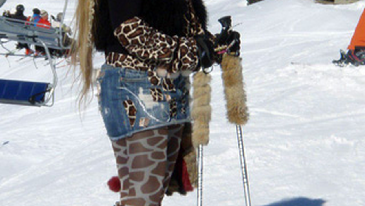 Ba chiar o fac perfect pe partie. Domnisoara din imagine crede ca este cea mai cool fata de la munte. Ea a ales o vestimentatie „demna” de mers la schi. Blonda cu extensii poarta fusta scurta mulata de blugi, ciorapi, haina, bentita si jambiere animal print si cireasa de pe tort… claparii si schiurile cu blanita. Bineinteles ca nu lipsesc nici ochelarii de soare ca sa nu cumva sa ii intre fetei soarele in ochi si sa-i curga rimelul.