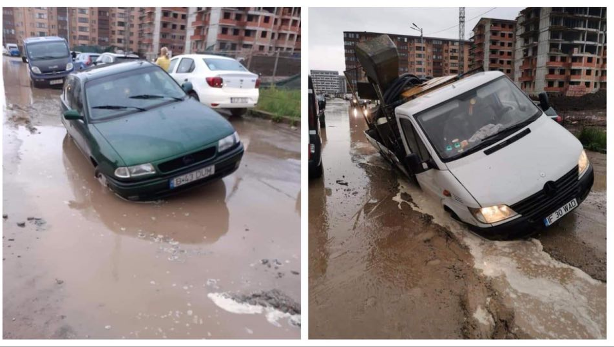 Este dezastru în Chiajna, Ilfov, din cauza ploilor torențiale! O stradă s-a surpat, iar mai multe autoturisme și un TIR au rămas blocate.