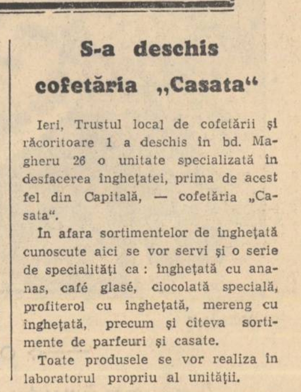 Cofetăria, care va purta denumirea de „Casata”, va pune zilnic la dispoziţia consumatorilor între 15 şi 20 feluri de îngheţată. În afara sortimentelor cunoscute, ce se vînd în mod curent prin cofetării, aici se vor servi diferite specialităţi, cum ar fi: îngheţată cu cafea albă, îngheţată cu alune, café glace, ciocolată specială, îngheţată cu ananas, îngheţată cu fructe, profiterol cu îngheţată, mereng cu îngheţată etc.