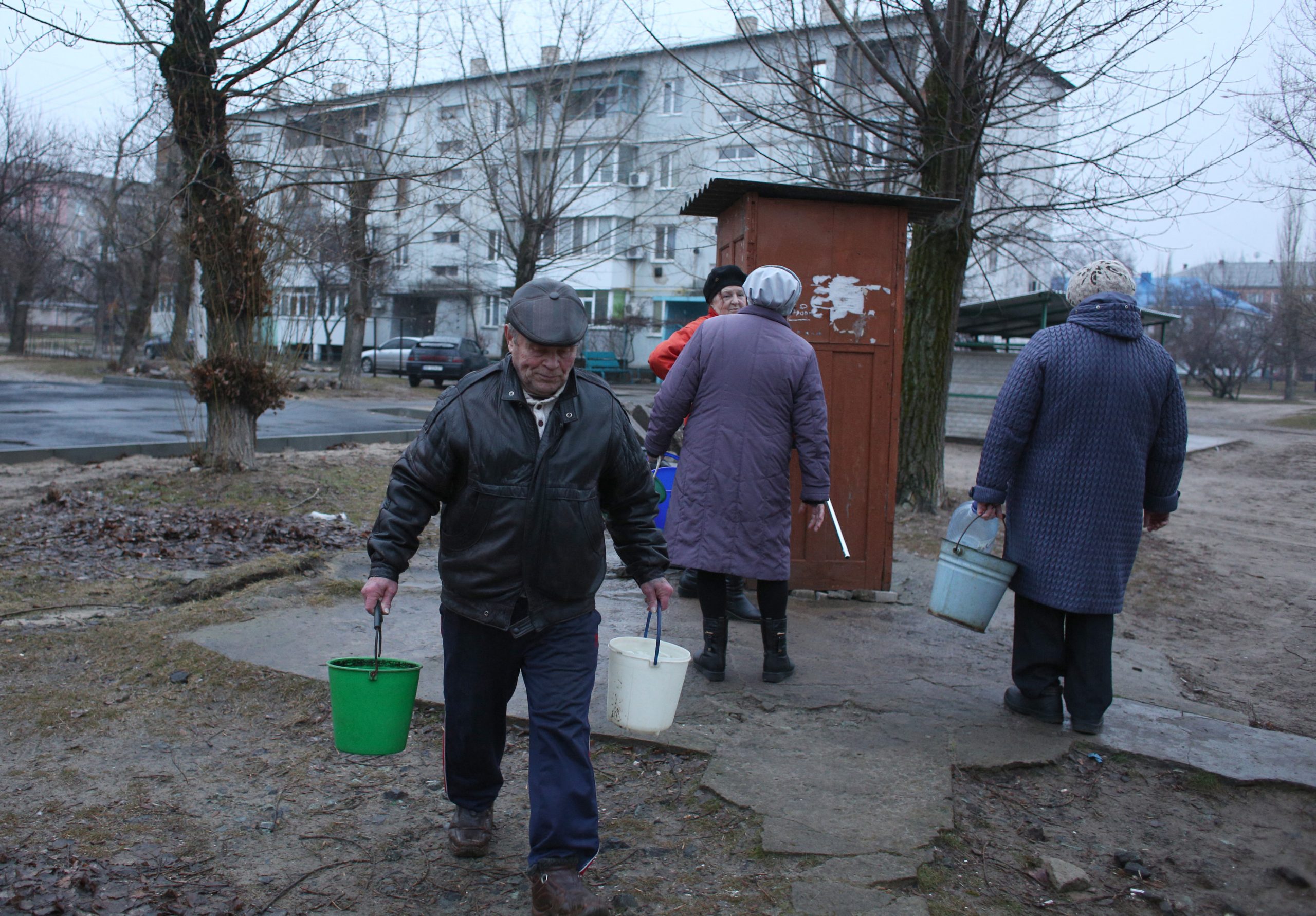 Oamenii aduc apă dintr-o fântână din orașul Schastia, în apropiere de orașul Lugansk, din estul Ucrainei, pe 23 februarie 2022, după ce bombardamentele au distrus rețeaua de curect. (Sursa foto: profimedia.ro)