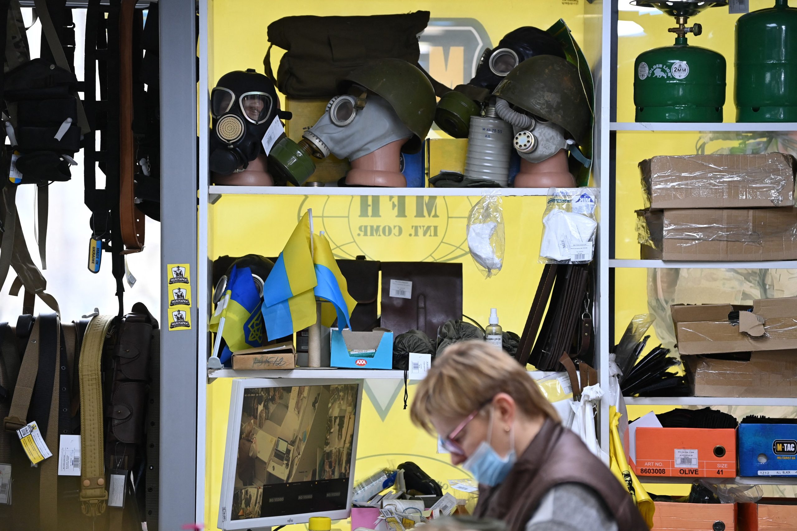 Măști de gaz, în magazinul de echipamente militare Milika, din Kiev, pe 23 februarie 2022. (Sursa foto: profimedia.ro)