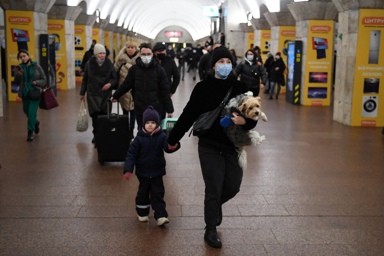 O femeie și copilul ei, dar și câinele lor, într-o stație de metrou din Kiev, la începutul zilei de 24 februarie 2022. (Sursa foto: profimedia.ro)