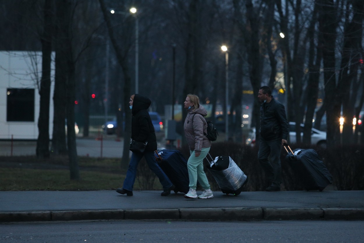 Oamenii merg pe o stradă din Kiev, cu bagajele făcute. (Sursa foto: profimedia.ro)