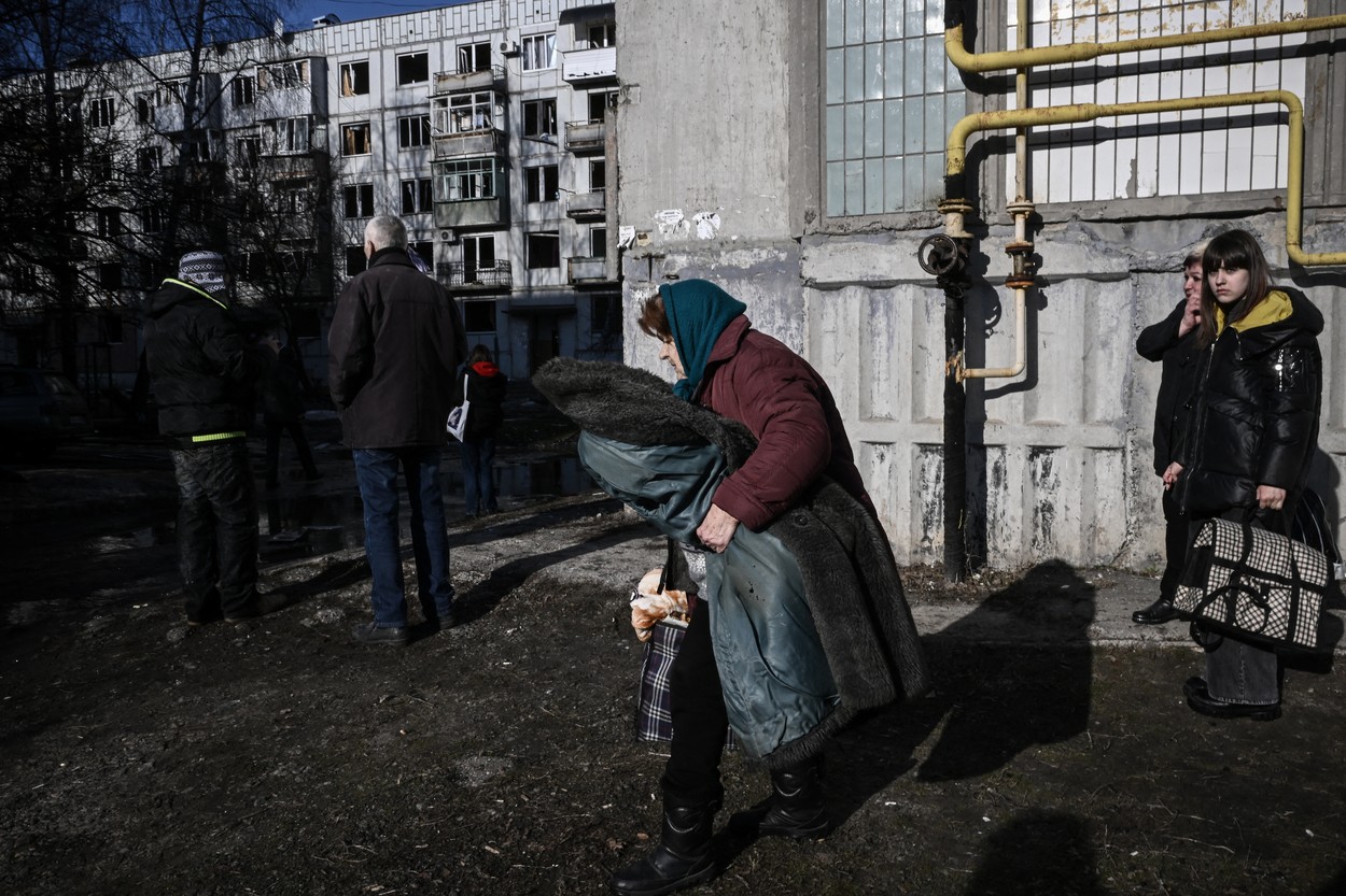 Oamenii părăsesc clădirea distrusă, după bombardamentele asupra orașului Chuguiv, din estul Ucrainei, pe 24 februarie 2022. (Sursa foto: profimedia.ro)