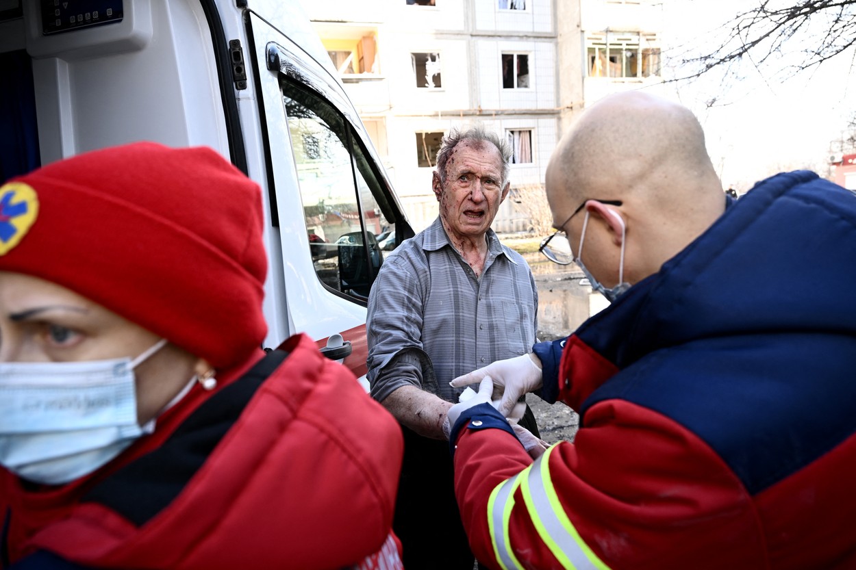 Personalul medical tratează un bărbat rănit, după bombardamentele asupra orașului Chuguiv, din estul Ucrainei, pe 24 februarie 2022. (Sursa foto: profimedia.ro)