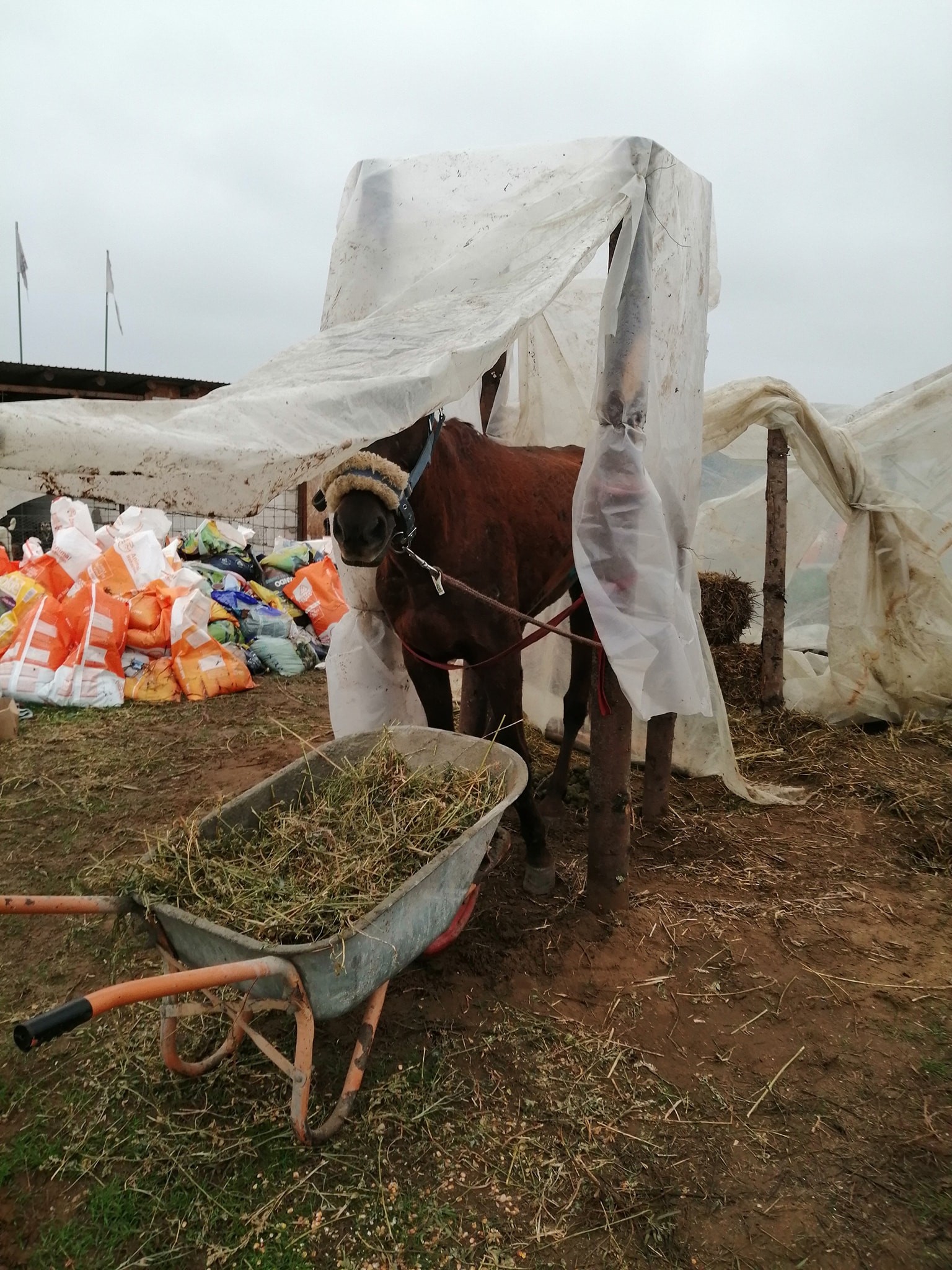 A ajuns la disperare din lipsă de fonduri. Proprietara unui adăpost de animale din Dolj a făcut un cort din celofan pentru un căluţ