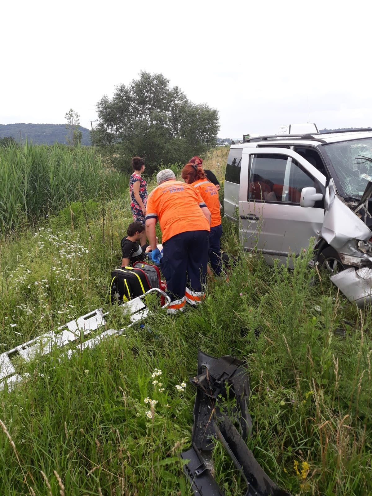 Accident cu un mort și patru răniți la Ineu. Șoferul unui BMW a ratat o curbă și a intrat într-un microbuz