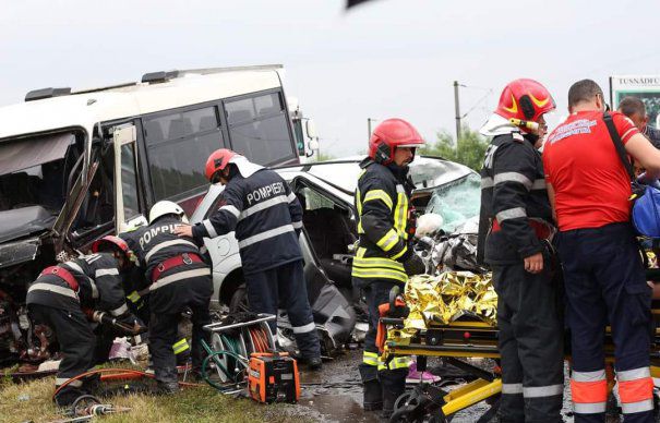 Accident cumplit în Brăila! O mașină a lovit un microbuz cu 19 pasageri. Mai multe persoane sunt rănite