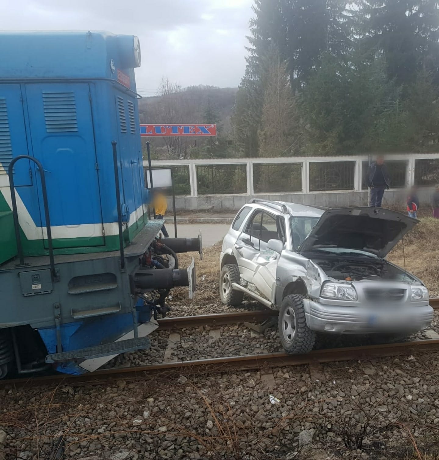 VIDEO. Accident feroviar la Pucioasa. O locomotivă a lovit o mașină, doi răniți au fost transportați la spital