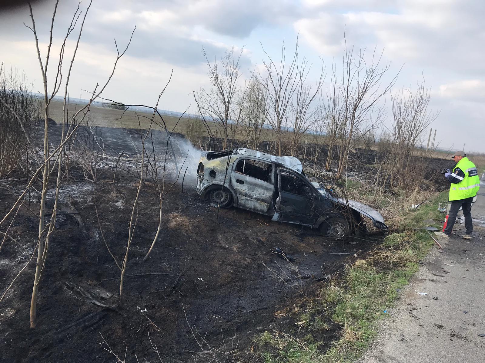 Accident grav din cauza unui incendiu de vegetație pe DJ 507, în Giurgiu. Doi oameni au fost răniți, mașinile sunt distruse