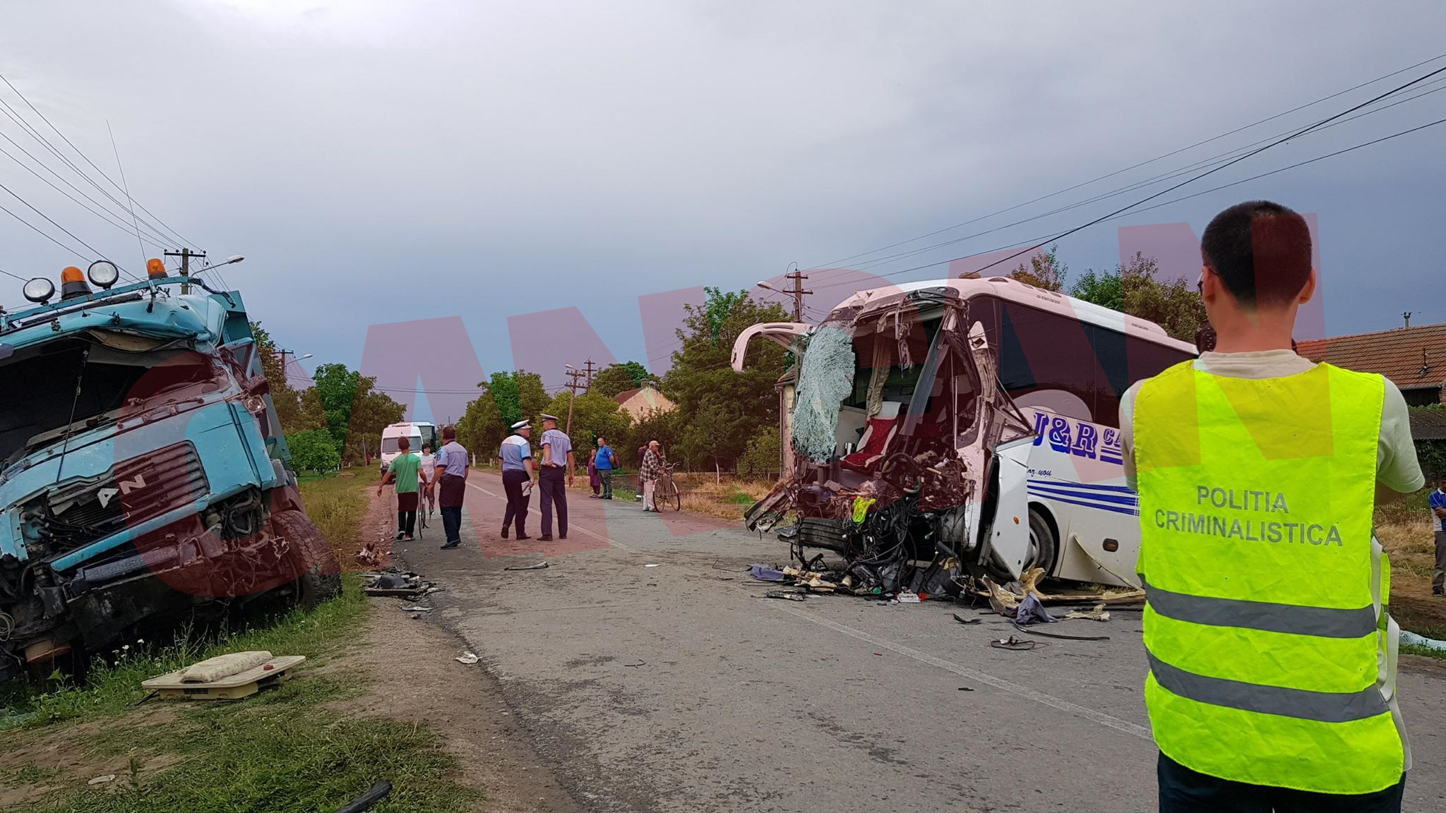 Accident înfiorător în județul Arad, după ce un autobuz plin cu oameni s-a ciocnit cu o autobasculantă. Victimele sunt luate cu elicopterul