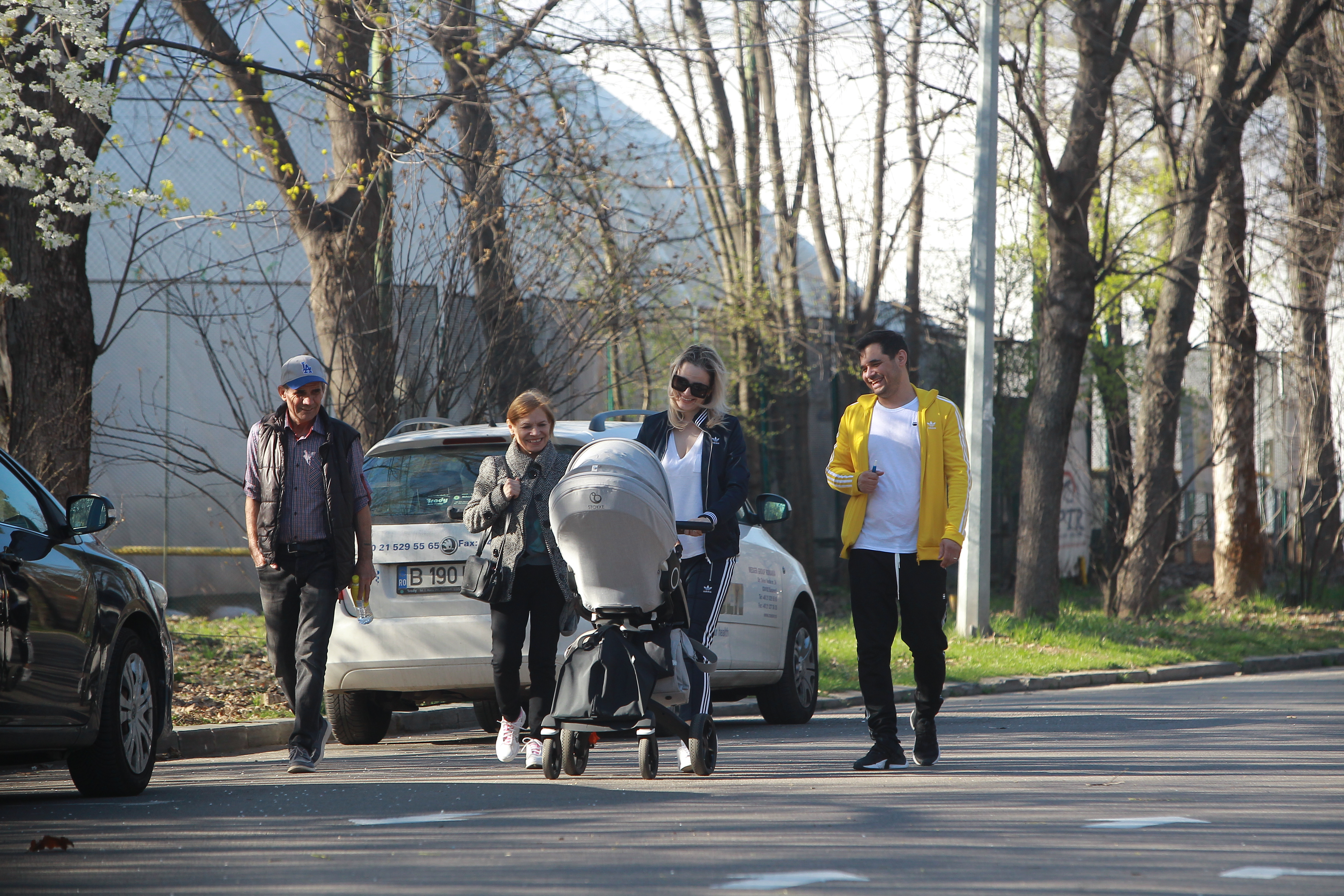 Cei patru se amuză, probabil după un gest făcut de micuț în landou