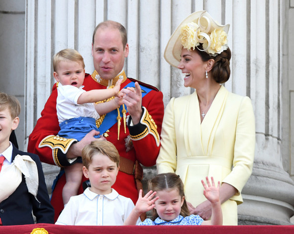 LONDON, ENGLAND - JUNE 08: Prince Louis, Prince George, Prince William, Duke of Cambridge, Princess Charlotte and Catherine, Duchess of Cambridge appear on the balcony during Trooping The Colour, the Queen's annual birthday parade, on June 08, 2019 in London, England. (Photo by Karwai Tang/WireImage)