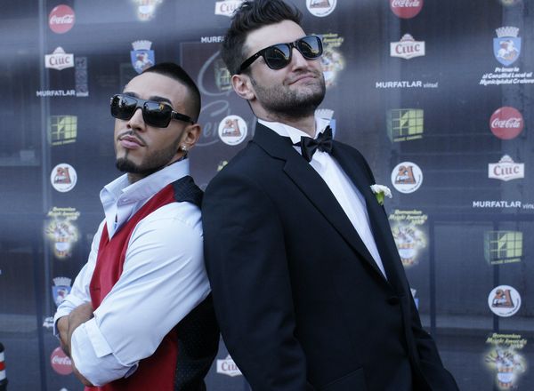 Cantaretii Alex Velea (S) si Smiley (D) pozeaza pe covorul rosu, la decernarea premiilor Romanian Music Awards, sambata, 10 iulie, la Craiova BOGDAN DANESCU / MEDIAFAXFOTO