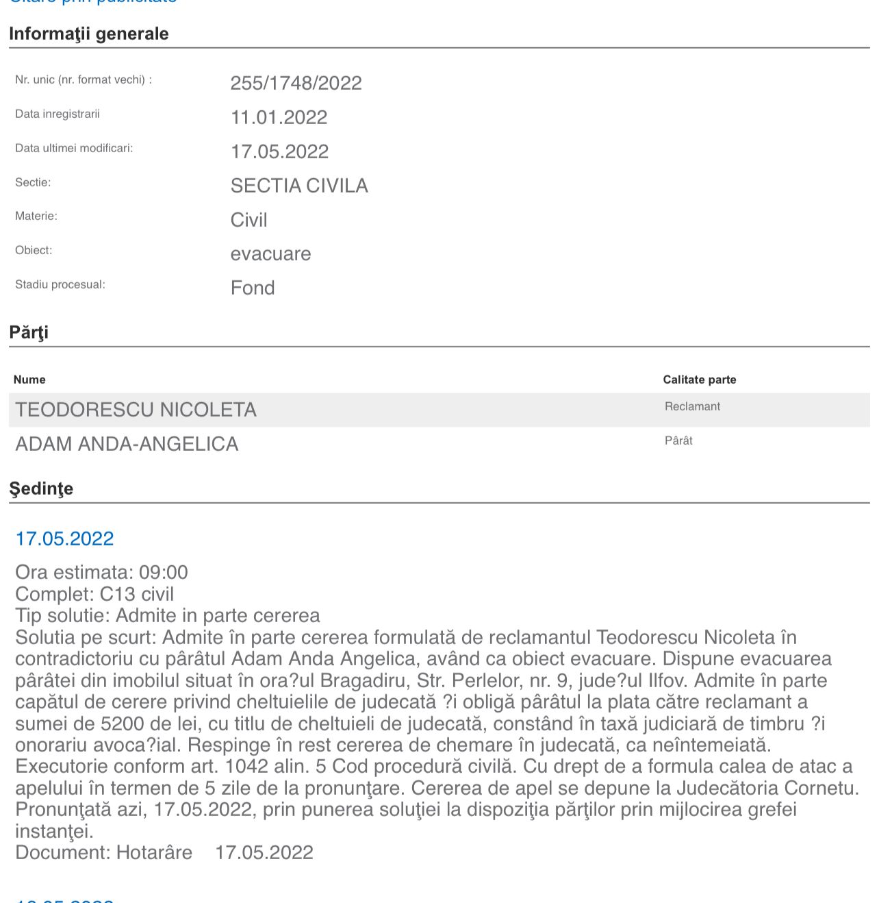 Decizia prin care instanța dispune ca artista să evacueze locuința