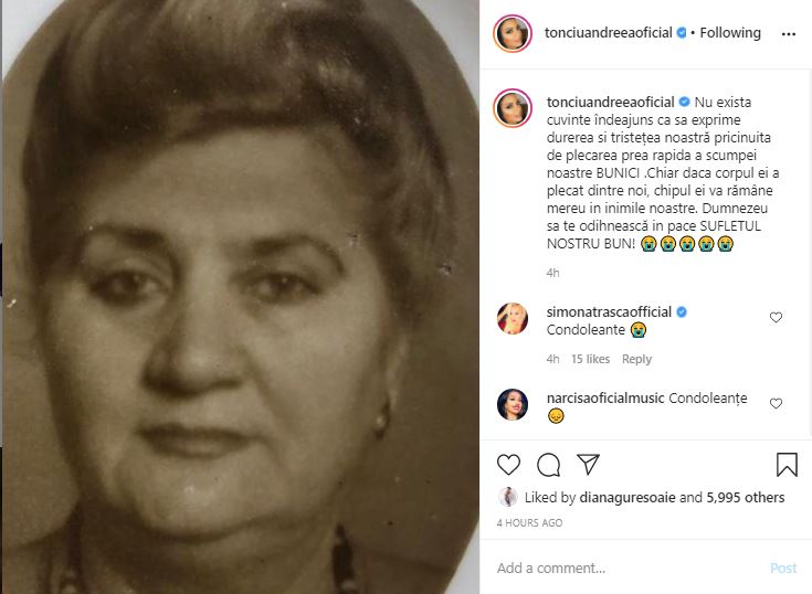 Andreea Tonciu, în doliu după moartea bunicii sale: “Am să te iubesc câte zile voi avea, iubirea mea bună”