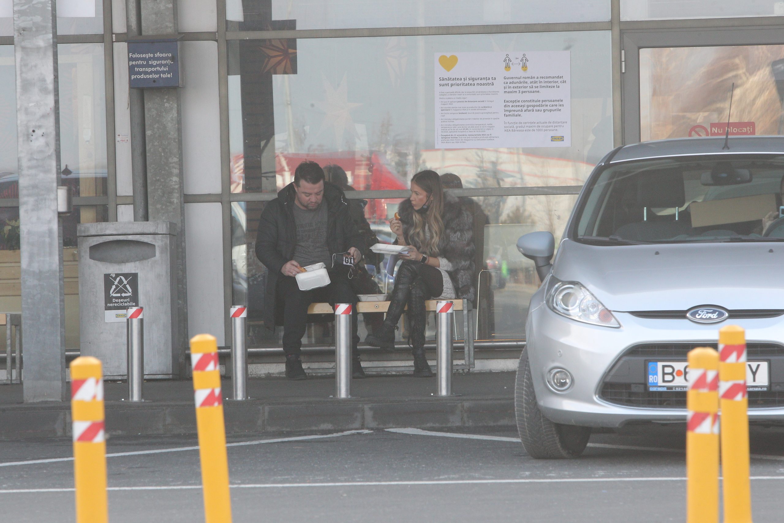 Andrei și Grațiela Duban înfulecă hotdog pe o bancă, la Ikea