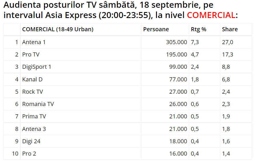 Antena 1 a dat lovitura cu Asia Express. Pro TV, în “corzi” cu Superstar. La ce s-a uitat lumea la TV, sâmbătă seara