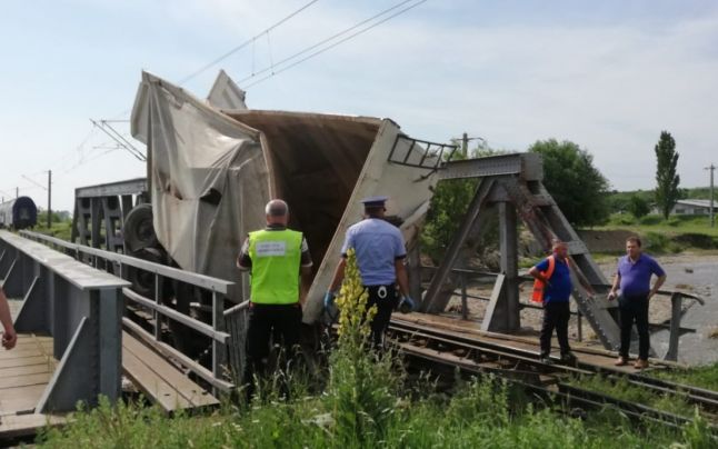 Accident pe calea ferată în județul Bacău. Locomotiva și un vagon al unui tren de persoane au deraiat, după impactul cu un camion