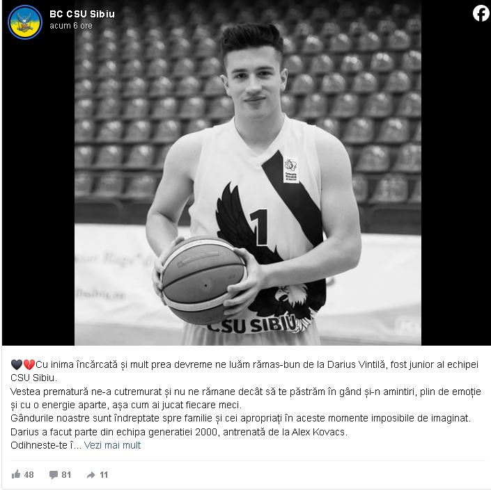 BREAKING | Darius Vintilă, fost jucător la CSU Sibiu, a murit fulgerător la doar 24 de ani