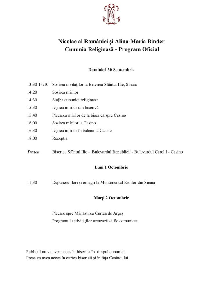 Programul nunții dintre Principele Nicolae și Alina Binder