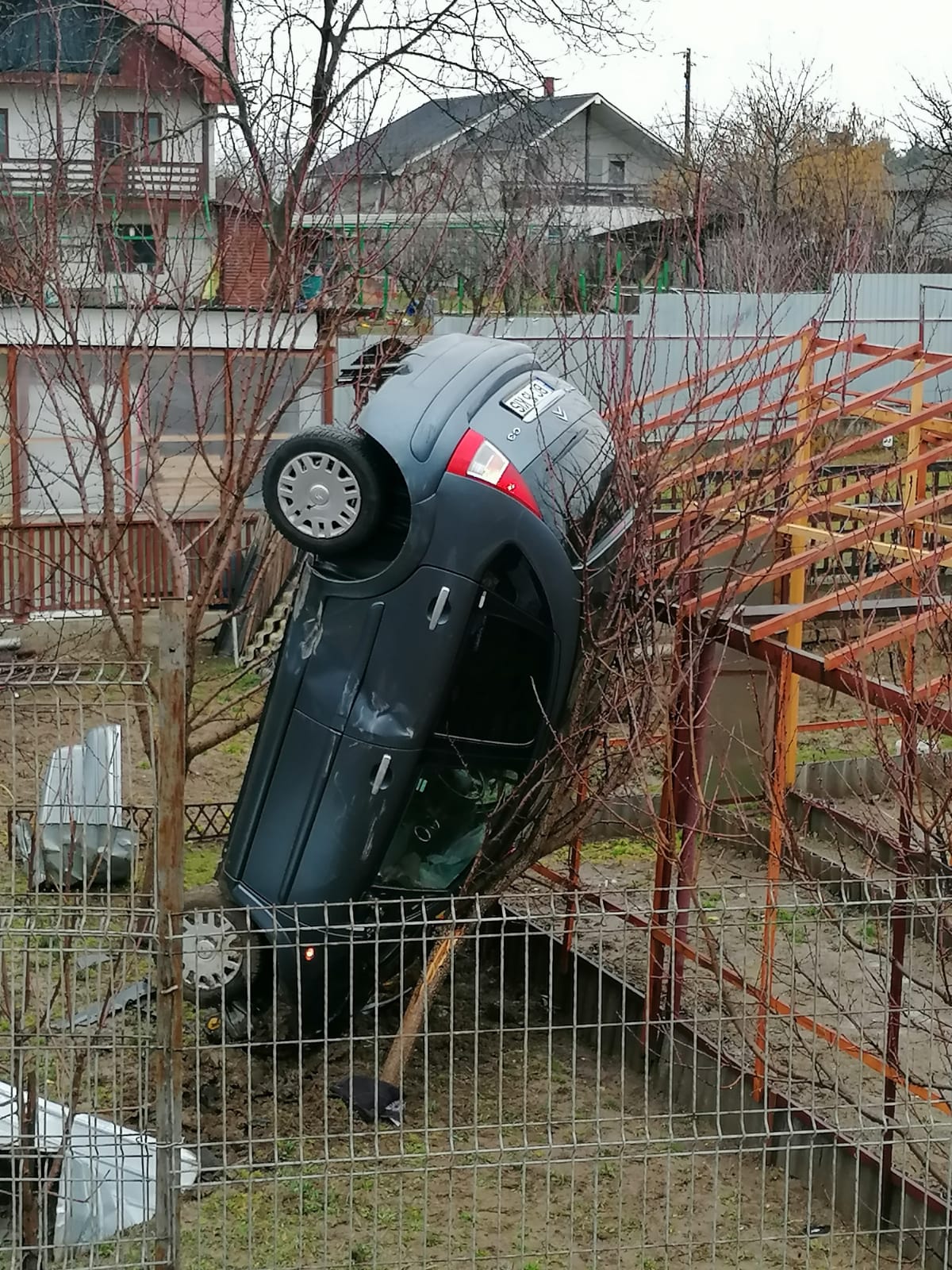 Mașina a rămas în poziție aproape verticală după impact