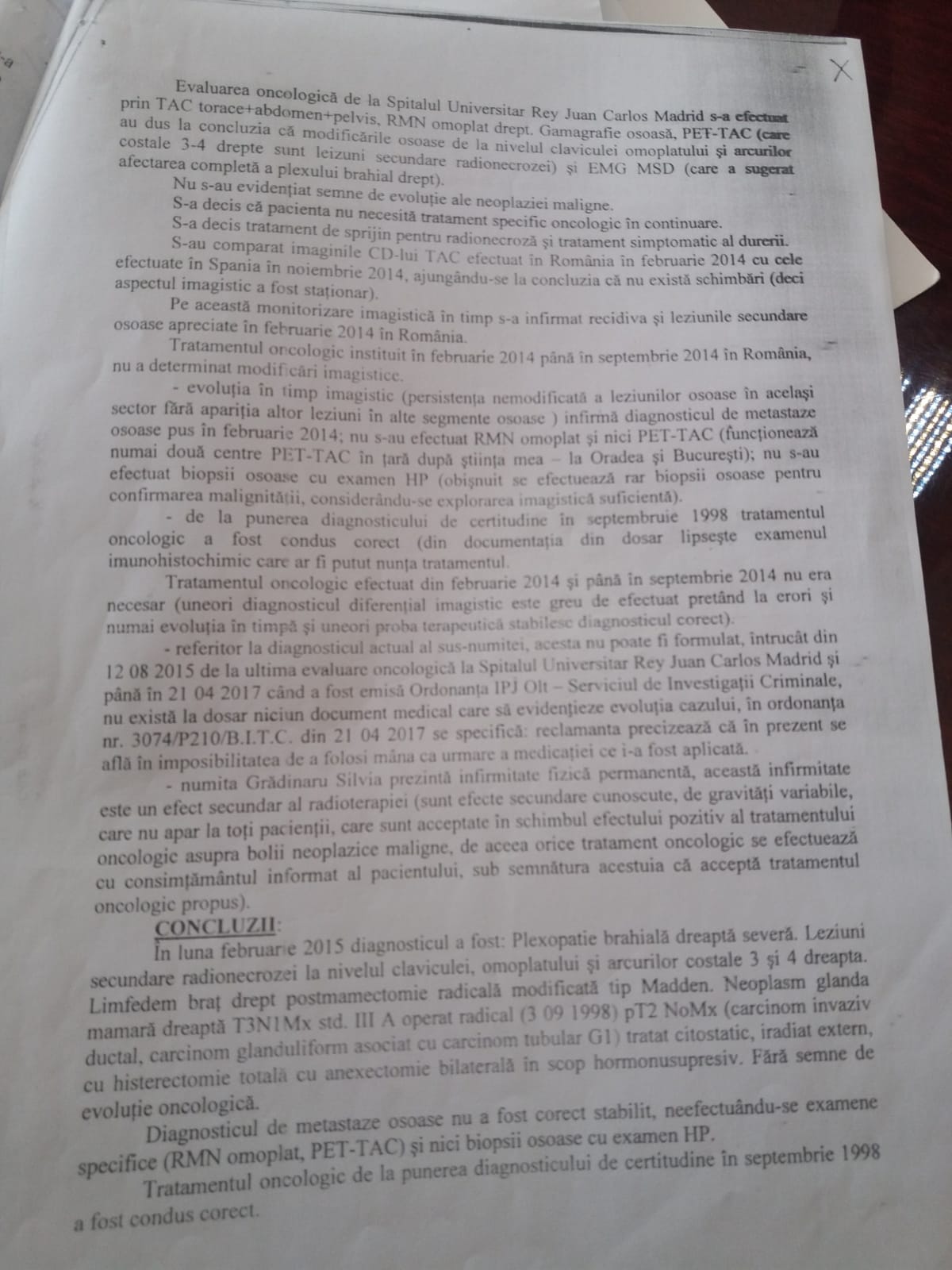 "Prezintă infirmitate fizică permanentă", scrie în evaluarea pacientei, ca "efect secundar al radioterapiei"