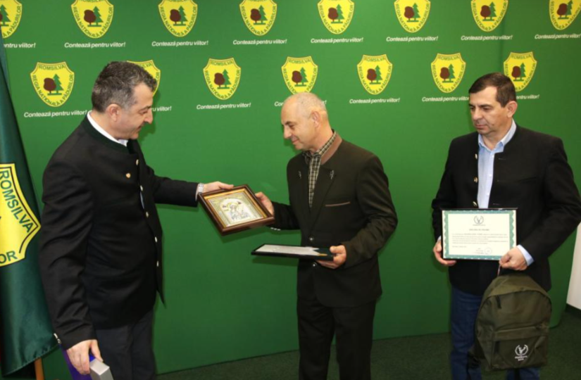 Romsilva l-a premiat pe pădurarul Aurel Frandeș, care a salvat două fetițe dispărute. Sursa foto: Romsilva/Facebook