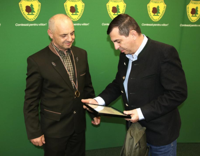 Romsilva l-a premiat pe pădurarul Aurel Frandeș, care a salvat două fetițe dispărute. Sursa foto: Romsilva/Facebook