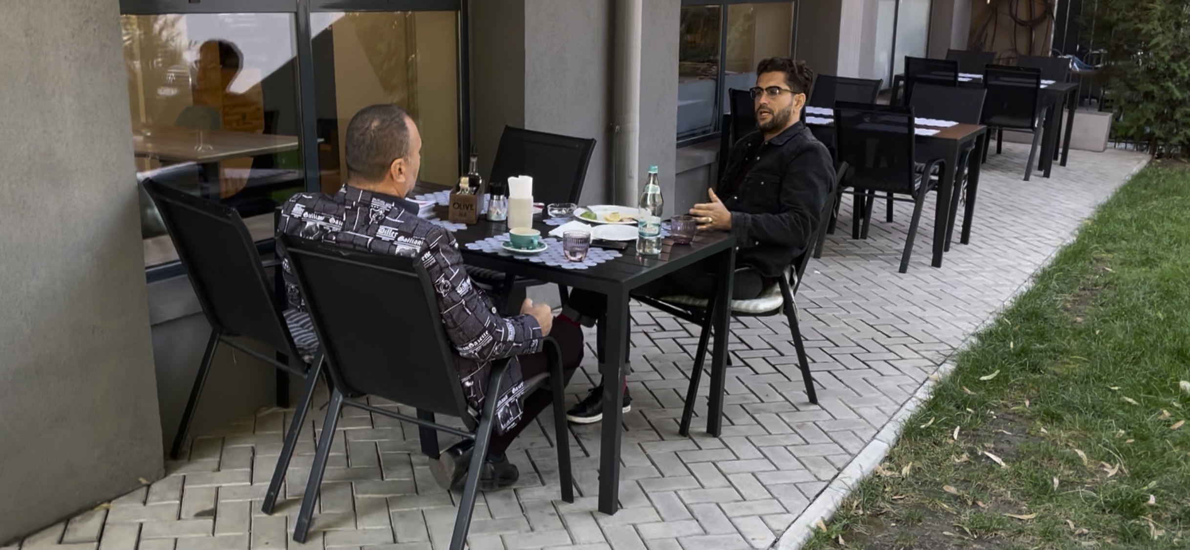 Cezar Ouatu era îmbrăcat casual, în timp ce amicul său purta o ținută elegantă