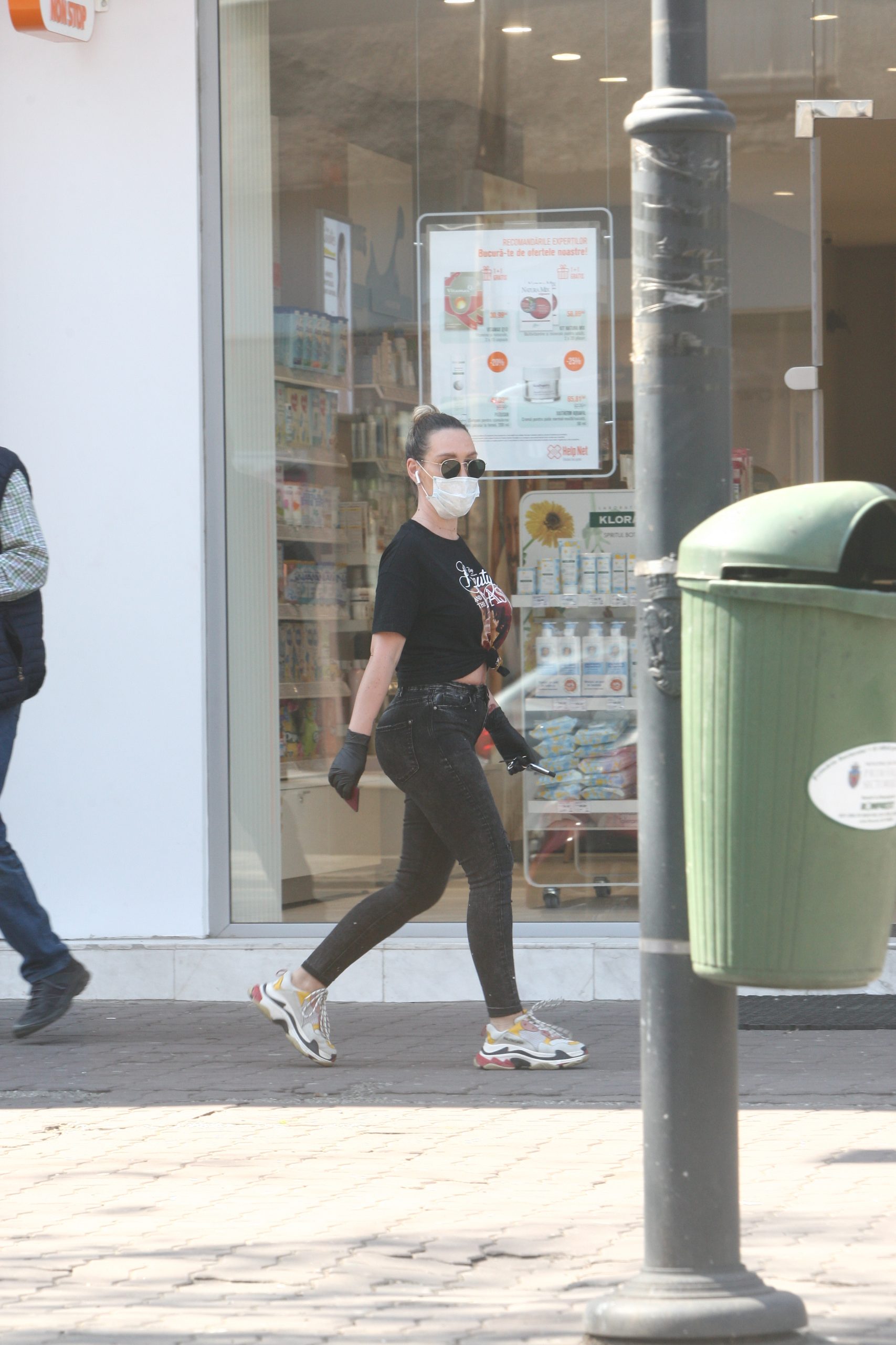 Cu masca de protecție pe față, Raluca se îndreaptă către un bancomat