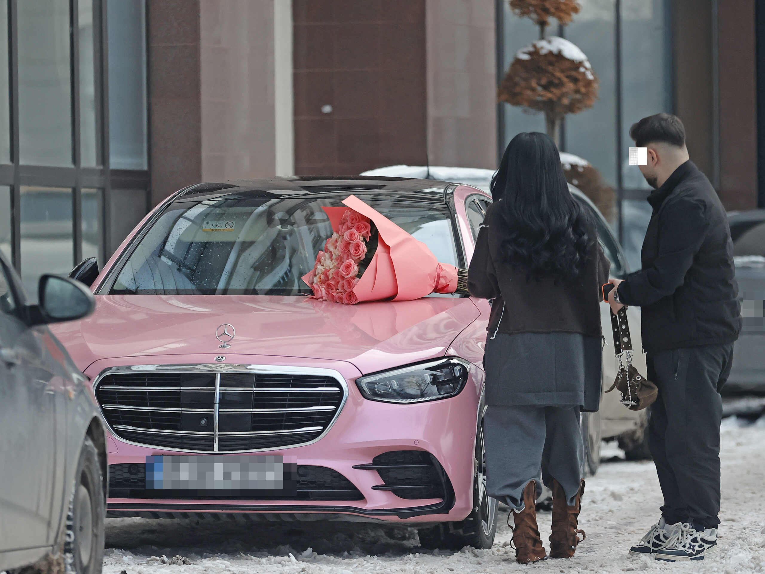 Un buchet uriaș de trandafiri o aștepta pe capota bolidului ei