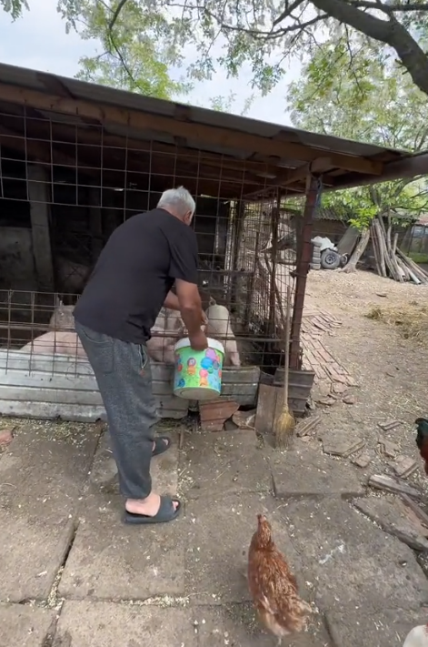 Nea Florică hrănește animalele din curte / sursă foto: captură Tik Tok