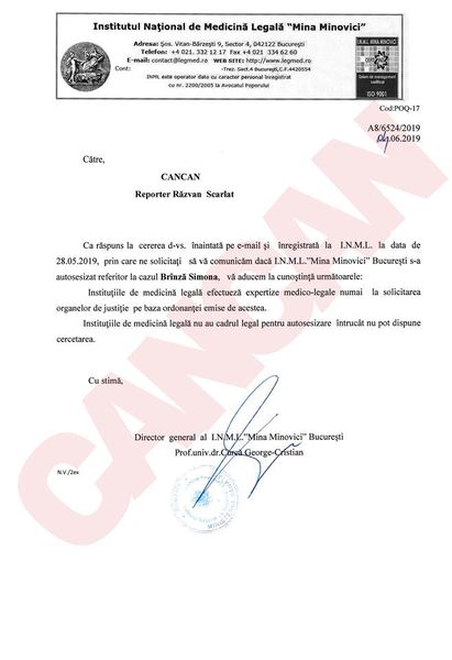 Răspunsul primit de CANCAN.RO din partea INML
