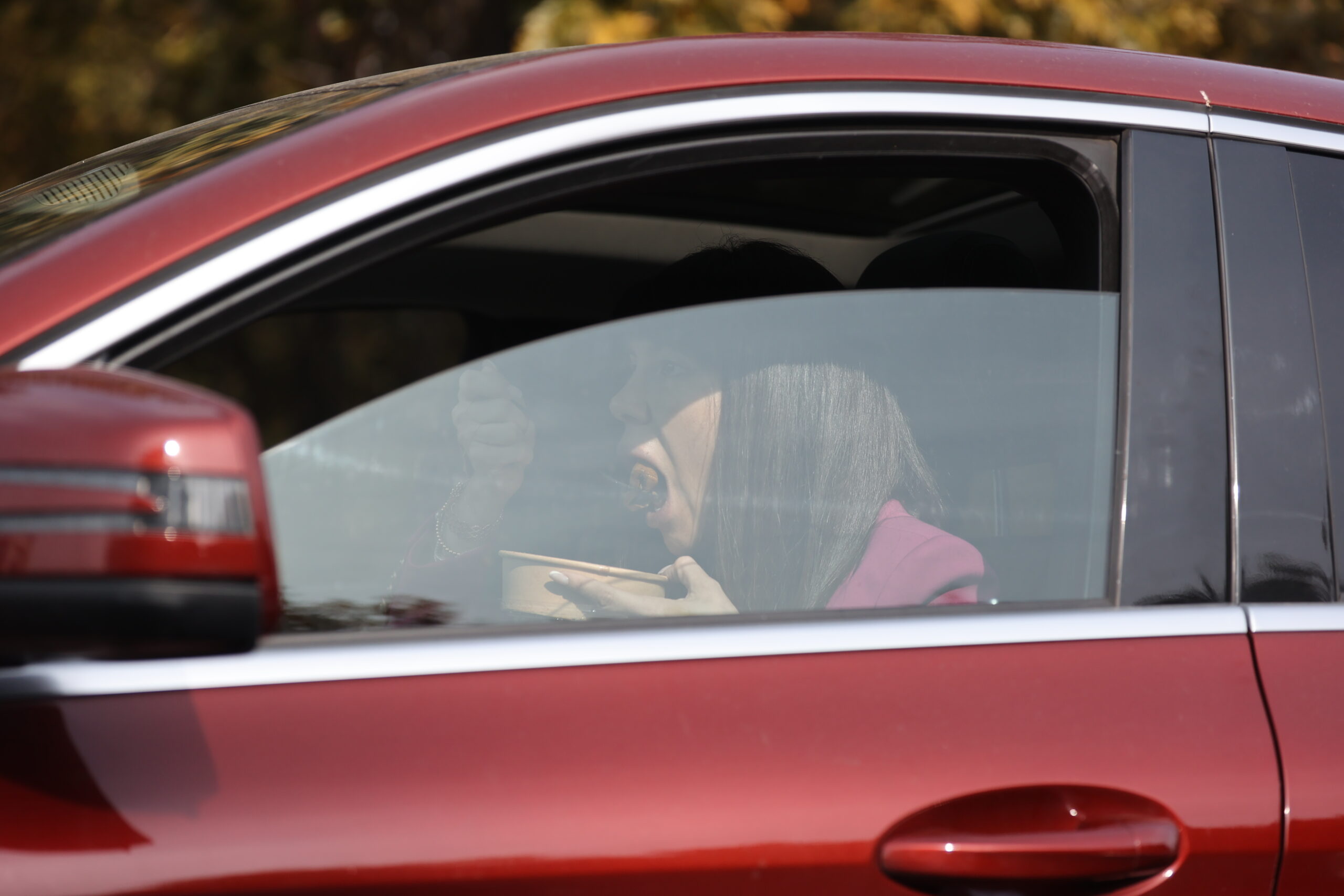 Denise Rifai mănâncă în mașină, în drum spre Kanal D (Foto: CANCAN.RO)