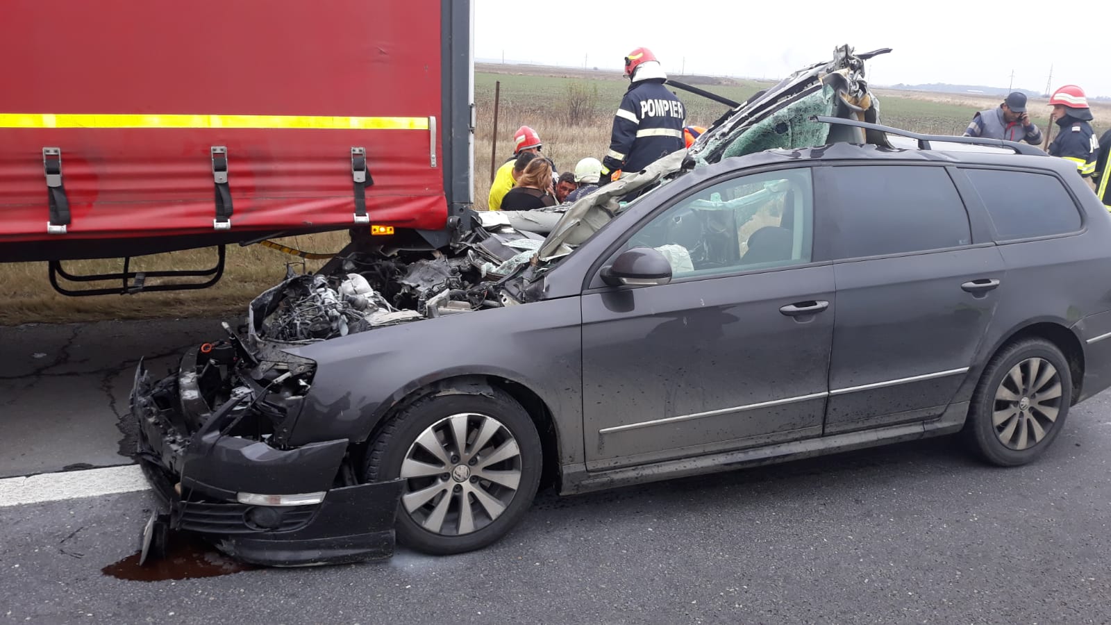 Doi răniți pe Autostrada București-Pitești, după ce o mașină s-a înfipt într-un camion. Un pompier a oprit pentru a acorda primul ajutor – VIDEO