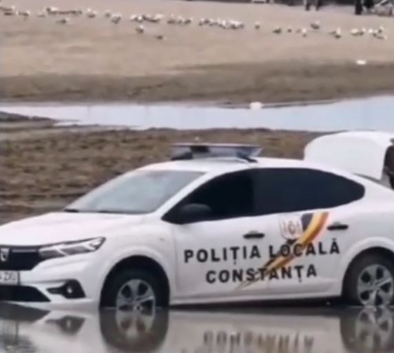 Mașina de poliție a rămas împotmolită în nisip, pe o plajă din Constanța