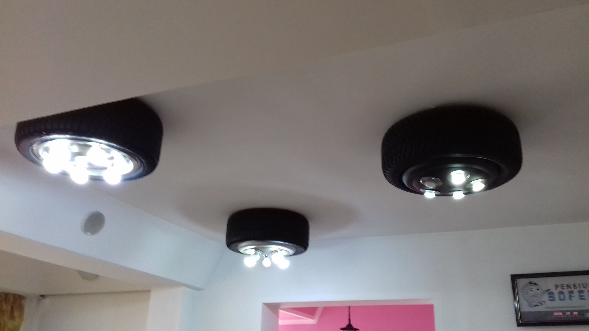 Roțile mașinii sunt folosite pentru iluminat în restaurantul pensiunii