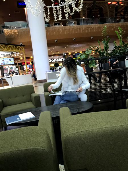 Blonda a așteptat cuminte pe canapeaua unei cafenele