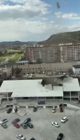 Un fenomen rar s-a produs în Râmnicu Vâlcea: un vârtej de vânt, asemănător unei tornade la scară mică, a distrus acoperișul unei parcări. sursă foto: captură video