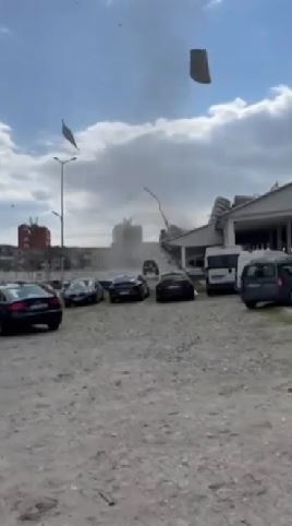 Un fenomen rar s-a produs în Râmnicu Vâlcea: un vârtej de vânt, asemănător unei tornade la scară mică, a distrus acoperișul unei parcări. sursă foto: captură video