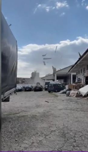 Un fenomen rar s-a produs în Râmnicu Vâlcea: un vârtej de vânt, asemănător unei tornade la scară mică, a distrus acoperișul unei parcări. sursă foto: captură video